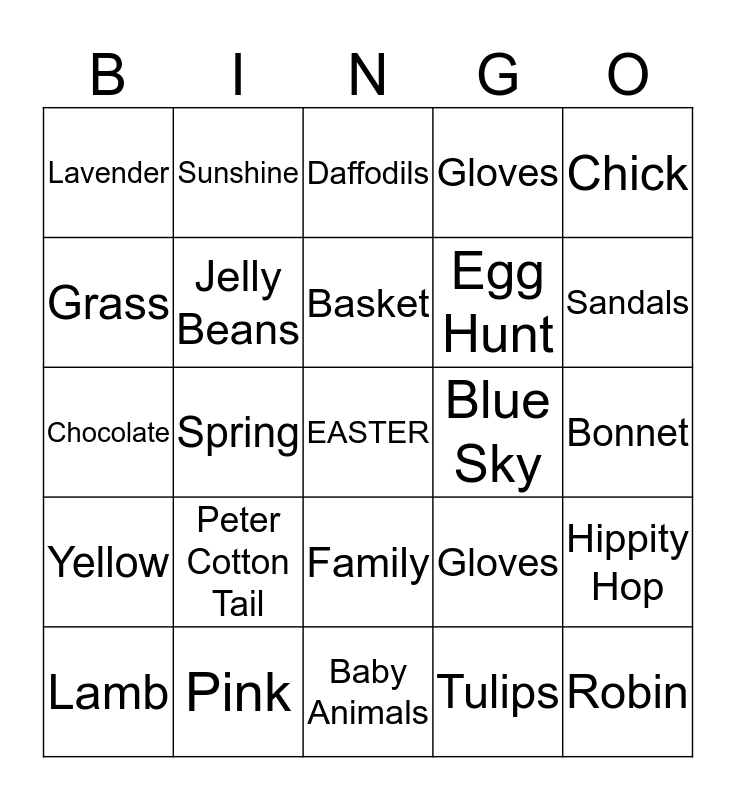 This bingo card has a free space and 24 words: Peter Cotton Tail, Pink, Basket, Lamb, Chick, Lavender, Grass, Sunshine, Blue Sky, Family, Egg Hunt, Chocolate, Gloves, Hippity Hop, Jelly Beans, Tulips, Bonnet, Daffodils, Sandals, Spring, Robin, Yellow, Gloves and Baby Animals.