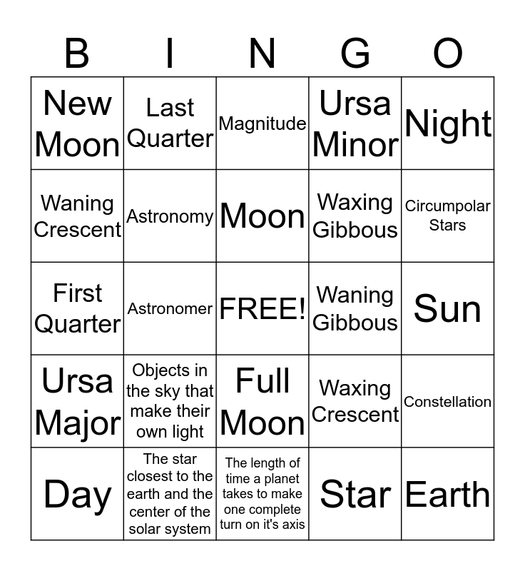 This bingo card has a free space and 24 words: Objects in the sky that make their own light, The star closest to the earth and the center of the solar system, Moon, Day, Night, New Moon, Waning Crescent, Last Quarter, Waning Gibbous, Full Moon, Waxing Gibbous, First Quarter, Waxing Crescent, Constellation, Astronomy, Star, Sun, Magnitude, Circumpolar Stars, Astronomer, Earth, Ursa Major, Ursa Minor and The length of time a planet takes to make one complete turn on it's axis.