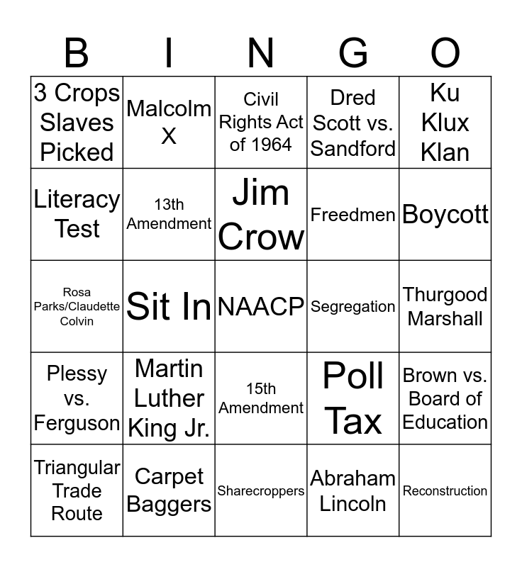 This bingo card has a free space and 24 words: Triangular Trade Route, Martin Luther King Jr., Jim Crow, Abraham Lincoln, Ku Klux Klan, 3 Crops Slaves Picked, Malcolm X, Civil Rights Act of 1964, Segregation, Thurgood Marshall, Rosa Parks/Claudette Colvin, 13th Amendment, Poll Tax, Brown vs. Board of Education, Literacy Test, Carpet Baggers, Sharecroppers, Dred Scott vs. Sandford, Boycott, Plessy vs. Ferguson, Sit In, 15th Amendment, Freedmen and Reconstruction.