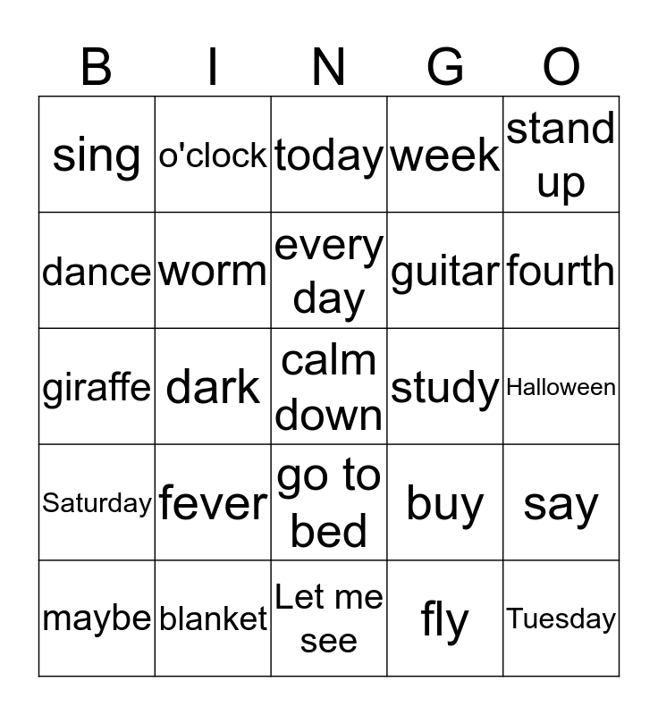 This bingo card has a free space and 24 words: fever, blanket, every day, maybe, stand up, sing, dance, o'clock, study, go to bed, guitar, giraffe, buy, say, worm, fly, Halloween, today, fourth, dark, Tuesday, Saturday, week and Let me see.