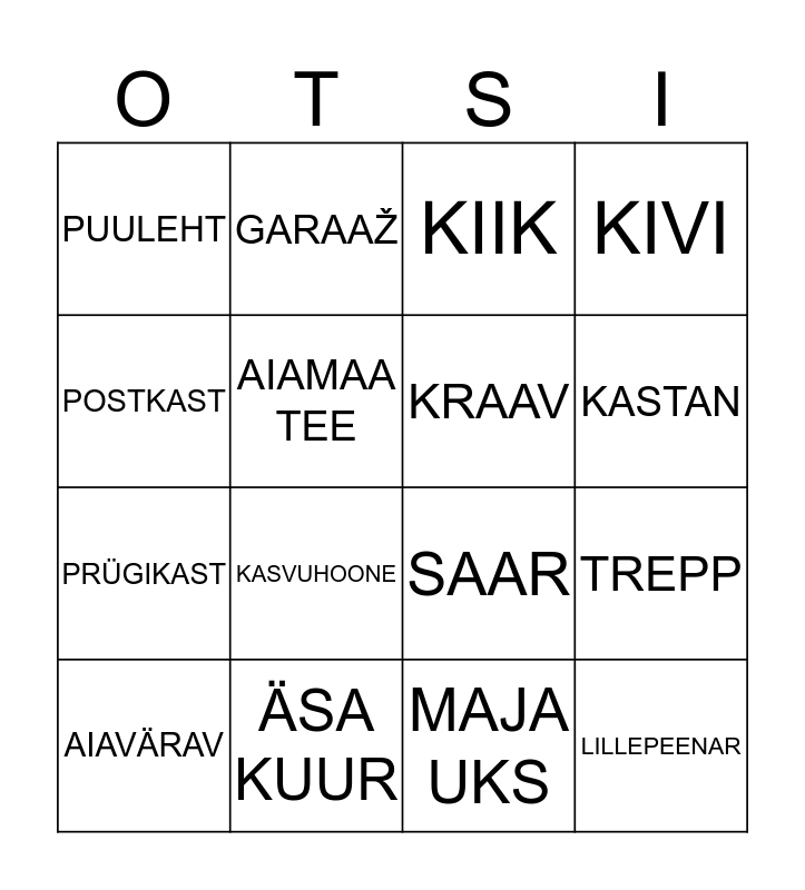 This bingo card has 16 words: ÄSA KUUR, TREPP, KIIK, PUULEHT, PRÜGIKAST, GARAAŽ, SAAR, MAJA UKS, POSTKAST, AIAMAA TEE, AIAVÄRAV, KIVI, KASVUHOONE, KASTAN, KRAAV and LILLEPEENAR.