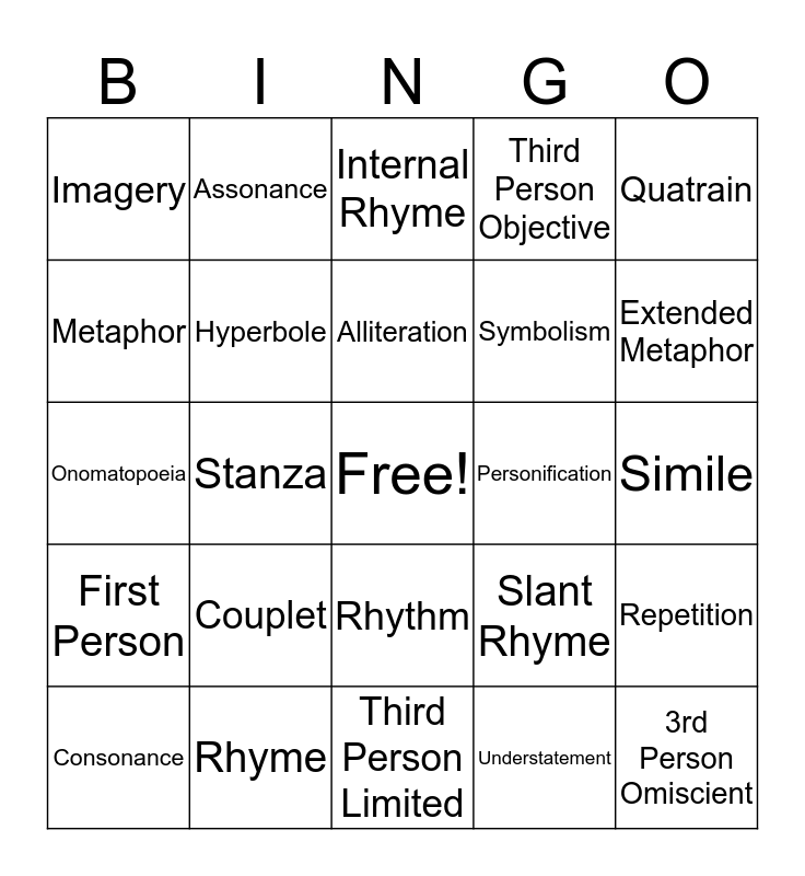 This bingo card has a free space and 24 words: Couplet, Rhyme, Alliteration, Consonance, Quatrain, Imagery, Metaphor, Assonance, Personification, Rhythm, Symbolism, Onomatopoeia, Slant Rhyme, Repetition, Hyperbole, Understatement, Simile, Internal Rhyme, Extended Metaphor, Stanza, 3rd Person Omiscient, First Person, Third Person Objective and Third Person Limited.