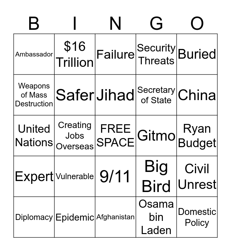 This bingo card has a free space and 96 words: Ambassador, Attacks, Civil Unrest, Gitmo, President Bush, Collateral Casualties, Intelligence, Benghazi, Security Threats, Outrageous, Secretary of State, Muslim, Israel, China, Expert, Weapons of Mass Destruction, Jihad, Al-Qaeda, Buried, It’s Great to be Here, Obama Administration, Domestic Policy, Obamacare, Out of Touch, 9/11, Afghanistan, Al-Qaeda, Ambassador, Attacks, Auto Bailout, Benghazi, Big Bird, Boca Raton, Budget, Buried, China, Civil Unrest, Collateral Casualties, Congress, Creating Jobs Overseas, Cuba, Diplomacy, Domestic Policy, Epidemic, Expert, Failure, Fiscal Plans, Foreign Policy, General Motors, Gitmo, House Budget Cmt., Intelligence, Iran, It’s Great to be Here, Jihad, Libya, Literally, Medicare, Members of our Military, Mexico, Middle East, Mortar Strike, Muslim, National Debt, National Security, Obama Administration, Obama Policy, Obamacare, Oppression, Osama bin Laden, Out of Touch, Outrageous, President Bush, Prevention, Putin, Reforms, Russia, Safer, Sanctions, Secretary of State, Security Threats, Senate Foreign Relations Cmt., Seniors, Tell it Like it is, Terrorists, United Nations, Vulnerable, Weapons of Mass Destruction, Yemen, Ryan Budget, Obama Re-Election, Taxes, $716 Billion, Unemployment, $16 Trillion and Coal.