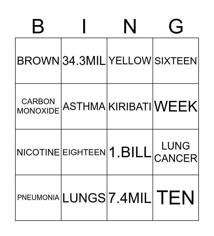 This bingo card has 16 words: LUNGS, LUNG CANCER, YELLOW, BROWN, NICOTINE, 34.3MIL, 1.BILL, 7.4MIL, CARBON MONOXIDE, ASTHMA, PNEUMONIA, SIXTEEN, EIGHTEEN, WEEK, KIRIBATI and TEN.