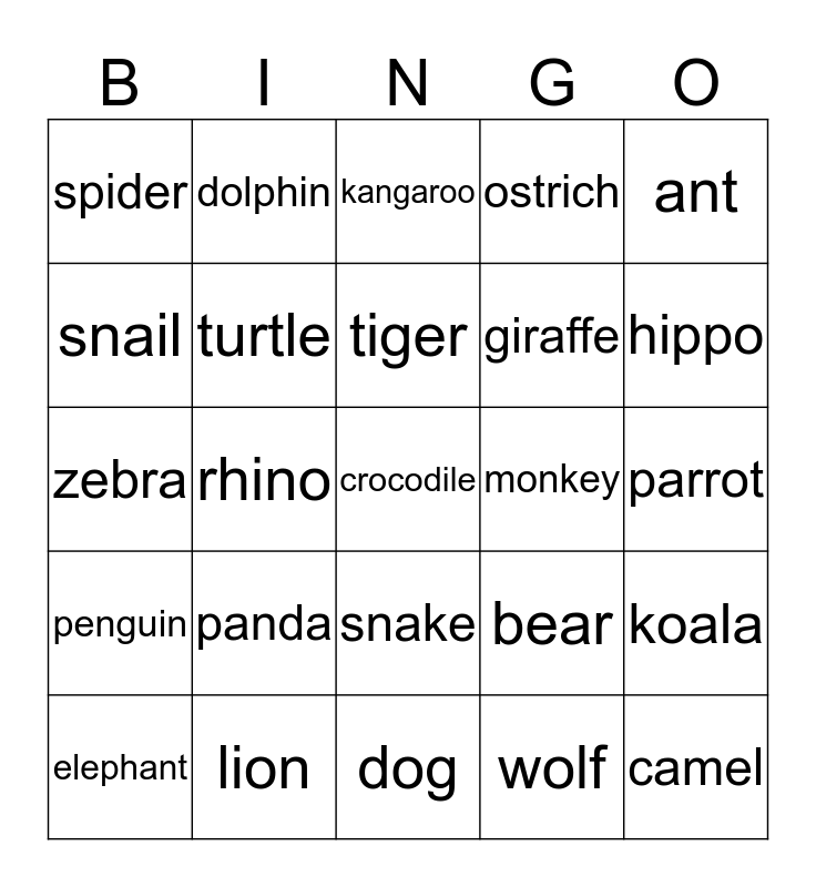 This bingo card has a free space and 24 words: panda, lion, tiger, elephant, ant, spider, snail, dolphin, monkey, snake, giraffe, zebra, bear, koala, turtle, wolf, parrot, kangaroo, hippo, rhino, camel, penguin, ostrich and dog.