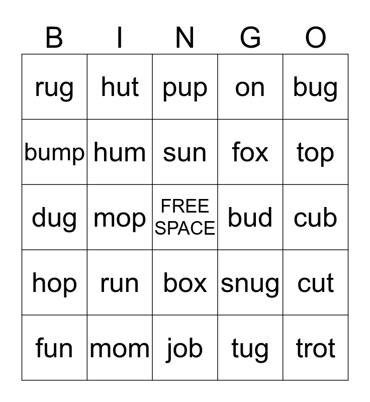 This bingo card has a free space and 24 words: fun, run, sun, tug, bug, rug, hut, pup, bud, cub, dug, hum, snug, cut, bump, mom, job, on, top, hop, mop, box, fox and trot.