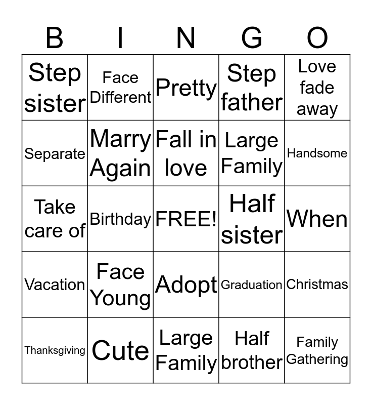This bingo card has a free space and 35 words: Wedding, Celebration, Divorce, Marry Again, Adopt, Step father, Separate, Quarrel, Fall in love, Not get along, Take care of, Love fade away, Step mother, Step brother, Step sister, Half sister, Half brother, Birthday, Vacation, Family Gathering, Graduation, Thanksgiving, Christmas, Cute, Pretty, Handsome, Look like you, Nice Family, Large Family, When, Where, Large Family, Face Young, Face Different and Face just the same.