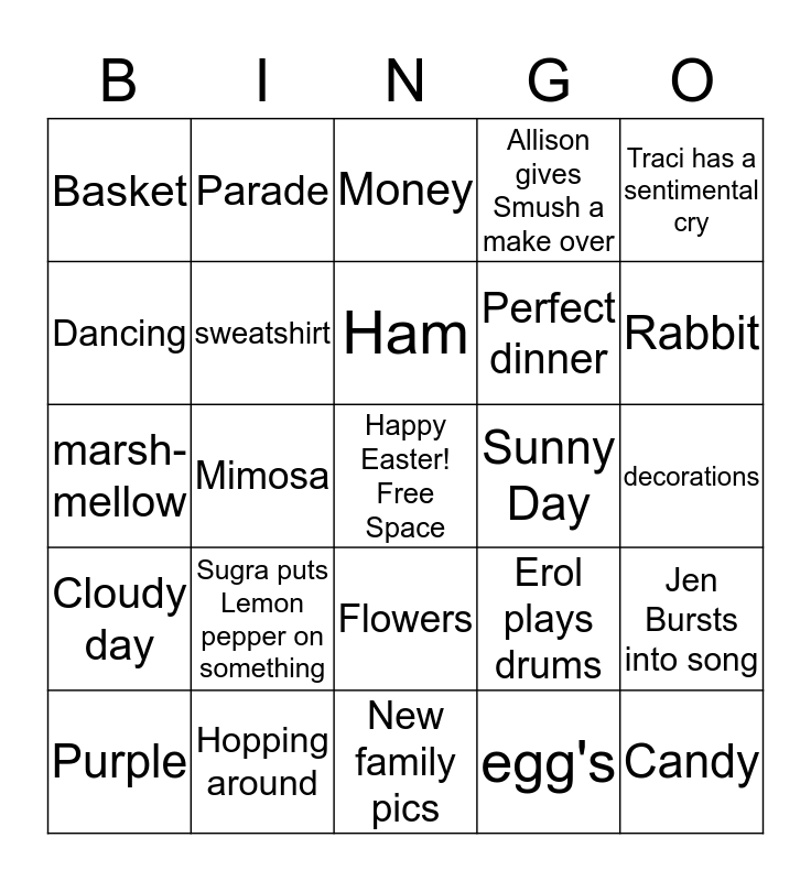 This bingo card has a free space and 24 words: Sugra puts Lemon pepper on something, Hopping around, Ham, Purple, Traci has a sentimental cry, Basket, Dancing, Parade, Sunny Day, Flowers, Perfect dinner, marsh- mellow, Erol plays drums, Jen Bursts into song, sweatshirt, egg's, decorations, Money, Rabbit, Mimosa, Candy, Cloudy day, Allison gives Smush a make over and New family pics.