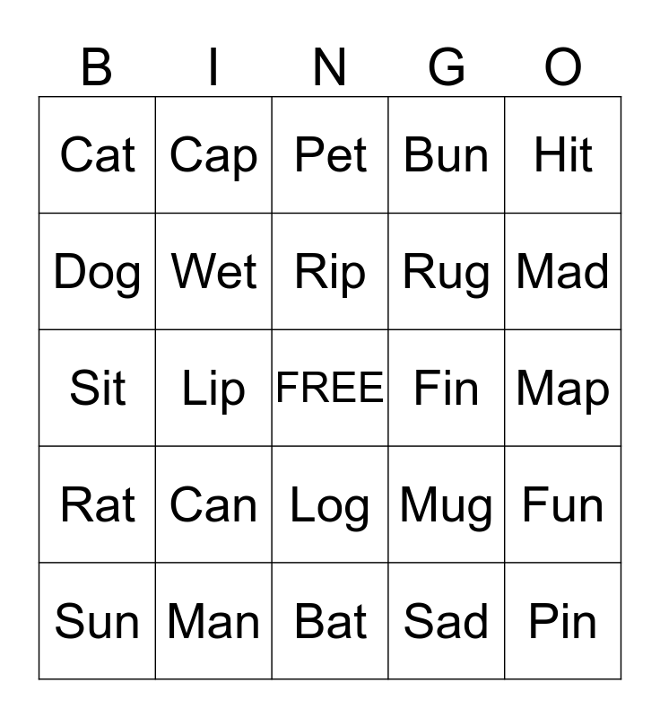 This bingo card has a free space and 24 words: Can, Man, Rip, Sun, Hit, Cat, Dog, Cap, Fin, Log, Rug, Sit, Mug, Fun, Wet, Sad, Map, Pet, Mad, Lip, Pin, Rat, Bun and Bat.