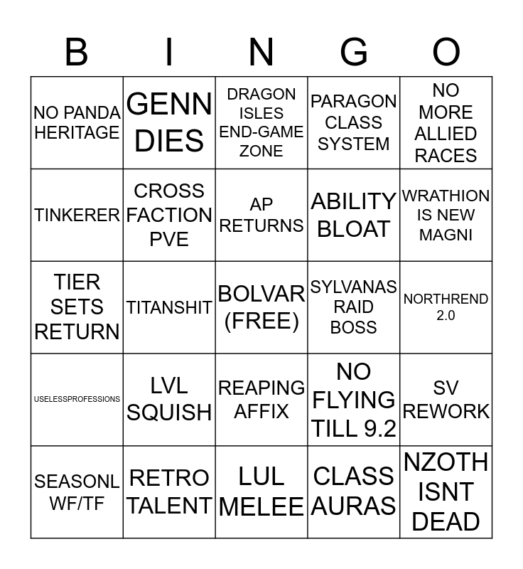 This bingo card has a free space and 24 words: LVL SQUISH, RETRO TALENT, AP RETURNS, SEASONL WF/TF, NO MORE ALLIED RACES, NO PANDA HERITAGE, TINKERER, GENN DIES, SYLVANAS RAID BOSS, REAPING AFFIX, ABILITY BLOAT, TIER SETS RETURN, NO FLYING TILL 9.2, SV REWORK, CROSS FACTION PVE, CLASS AURAS, NORTHREND 2.0, DRAGON ISLES END-GAME ZONE, WRATHION IS NEW MAGNI, TITANSHIT, NZOTH ISNT DEAD, USELESSPROFESSIONS, PARAGON CLASS SYSTEM and LUL MELEE.