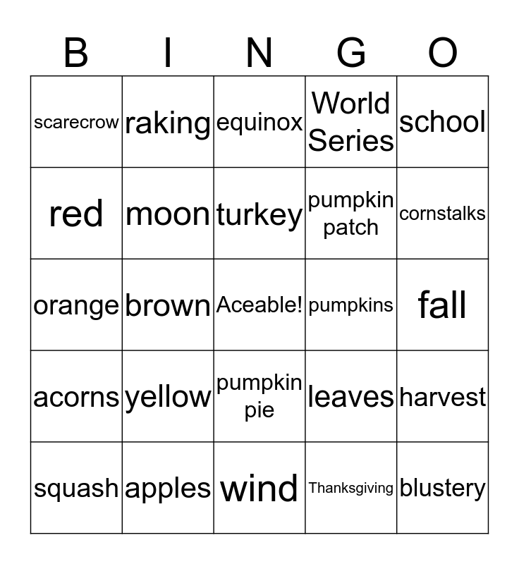 This bingo card has a free space and 25 words: yellow, wind, turkey, squash, school, scarecrow, red, raking, pumpkins, pumpkin pie, pumpkin patch, orange, leaves, harvest, moon, gourds, fall, equinox, cornstalks, brown, blustery, apples, acorns, World Series and Thanksgiving.