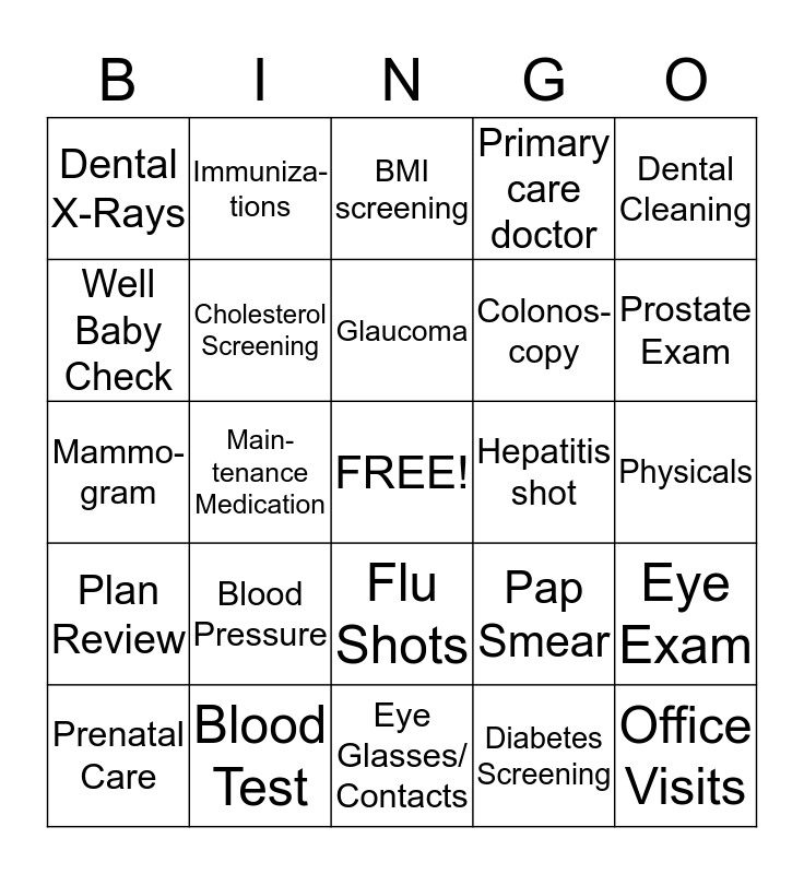 This bingo card has a free space and 24 words: Blood Pressure, Blood Test, Glaucoma, Prenatal Care, Dental Cleaning, Dental X-Rays, Well Baby Check, Immuniza-tions, Hepatitis shot, Flu Shots, Colonos-copy, Mammo- gram, Pap Smear, Eye Exam, Cholesterol Screening, Diabetes Screening, Physicals, BMI screening, Prostate Exam, Main-tenance Medication, Office Visits, Plan Review, Primary care doctor and Eye Glasses/ Contacts.