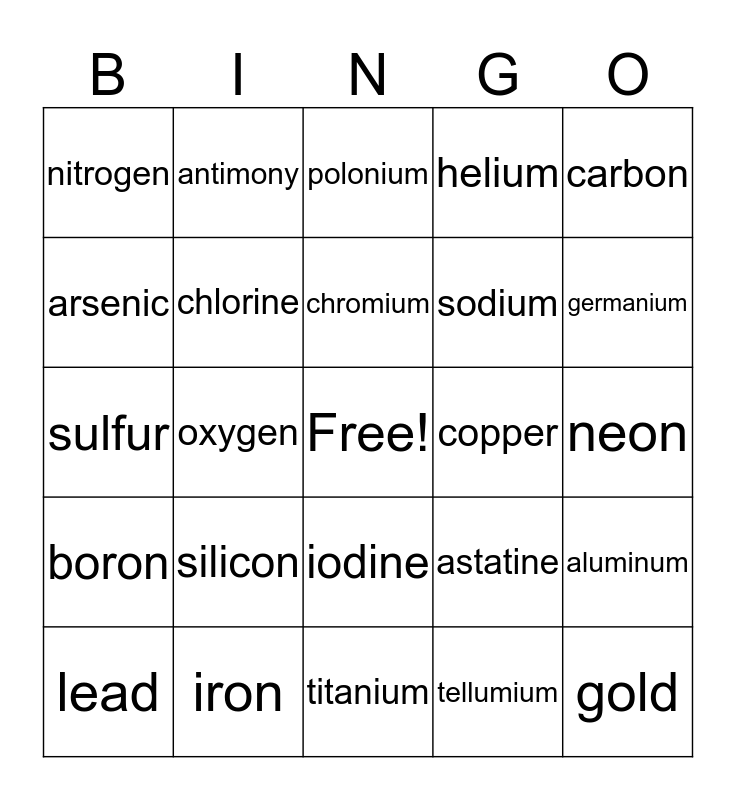 This bingo card has a free space and 24 words: silicon, iron, chromium, lead, carbon, nitrogen, arsenic, antimony, copper, iodine, sodium, sulfur, astatine, aluminum, chlorine, tellumium, neon, polonium, germanium, oxygen, gold, boron, helium and titanium.