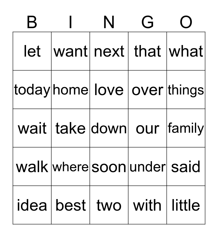 This bingo card has a free space and 49 words: three, little, their, two, where, going, want, here, today, but, home, that, said, under, don't, much, love, our, know, what, take, with, let, over, more, things, idea, school, soon, walk, often, always, such, great, best, find, think, until, family, last, never, high, house, easy, wait, next, same, pretty and ask.