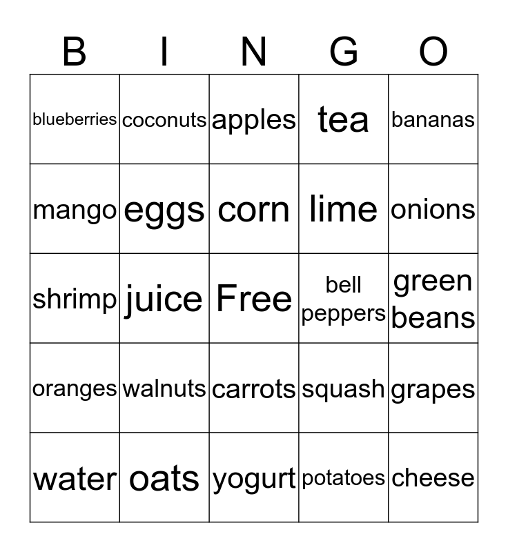 This bingo card has a free space and 29 words: water, milk, juice, watermelon, blueberries, apples, eggs, walnuts, bell peppers, oats, green beans, cheese, yogurt, potatoes, onions, cucumbers, carrots, oranges, bananas, shrimp, squash, lemon, lime, mango, tea, coconuts, grapes, corn and tomatoes.