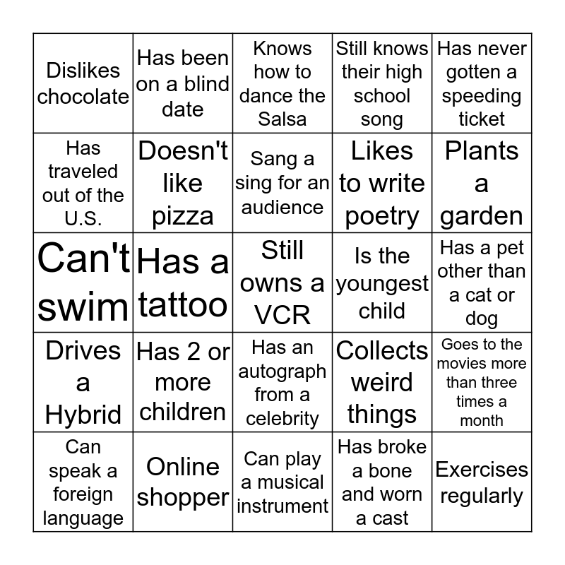This bingo card has 25 words: Has 2 or more children, Can play a musical instrument, Sang a sing for an audience, Can speak a foreign language, Has never gotten a speeding ticket, Dislikes chocolate, Has traveled out of the U.S., Has been on a blind date, Is the youngest child, Has an autograph from a celebrity, Likes to write poetry, Can't swim, Collects weird things, Goes to the movies more than three times a month, Doesn't like pizza, Exercises regularly, Has a pet other than a cat or dog, Knows how to dance the Salsa, Plants a garden, Has a tattoo, Still owns a VCR, Online shopper, Drives a Hybrid, Still knows their high school song and Has broke a bone and worn a cast.