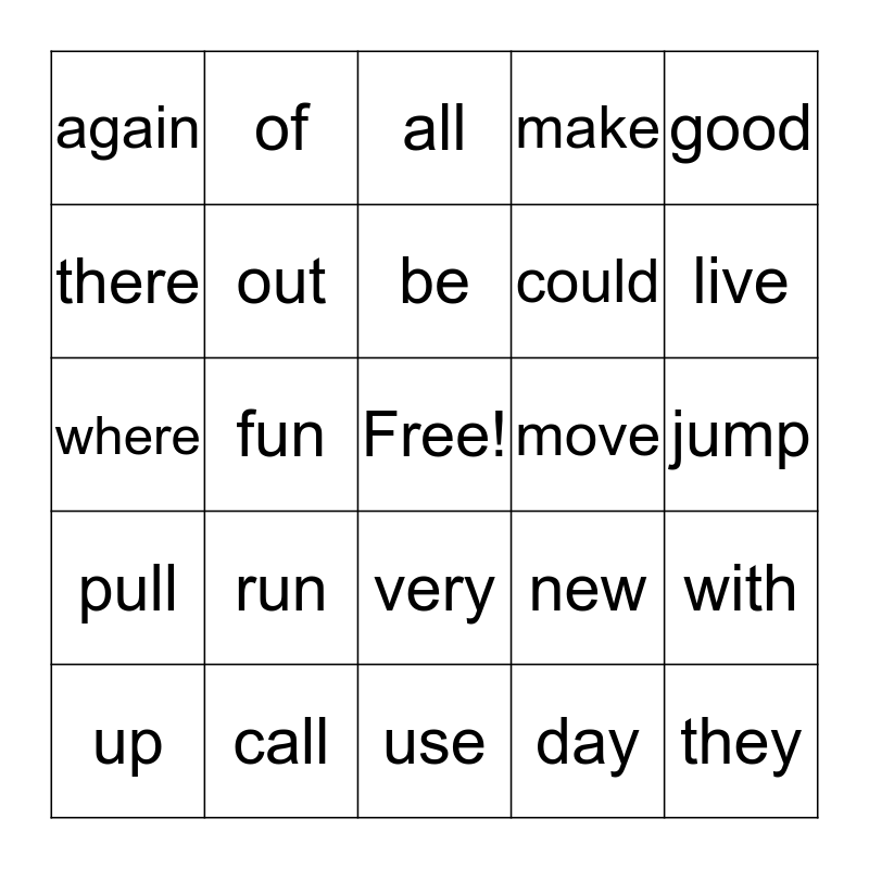This bingo card has a free space and 39 words: school, not, down, out, up, very, be, come, good, pull, fun, make, they, jump, move, run, two, again, help, new, there, use, could, live, one, then, three, eat, no, of, under, who, all, call, day, her, with, where and said.