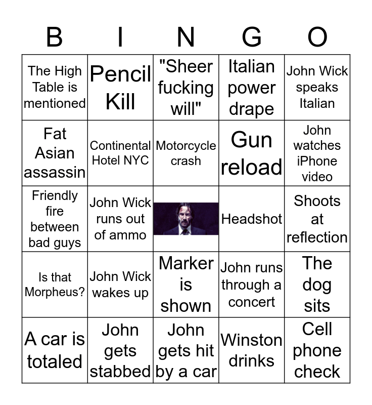 This bingo card has a free space and 59 words: Someone gets choked, John gets stabbed, "Babayaga", Is that Morpheus?, Winston drinks, John Wick drinks, Continental Hotel NYC, "Duck fat", Gun reload, Excommunicado, Italian power drape, "He's just one man", Fat Asian assassin, John Wick Judo toss, Common, The High Table is mentioned, Cell phone check, John Wick speaks Italian, John Wick grabs enemy gun, Motorcycle crash, Headshot, "Sheer fucking will", A car is totaled, The dog sits, Doubletap, Explosion, Contract opens, Onscreen blood, John watches iPhone video, Coin Exchange, Continental Hotel Rome, John Wick speaks Russian, Ruby Rose signs, Gun is thrown, Pencil Kill, John stabs someone, Call to an operator, John Wick runs out of ammo, John Leguizamo appears!, Friendly fire between bad guys, Dog whines, John Wick wakes up, Shoots at reflection, John is saved by hobo, Boobs, John Wick gets hit by bullet, Stylized subtitles, Picture of Helen, Marker is shown, John gets hit by a car, Shot from silenced pistol, John shoots a rifle, "Workin' again, Jon?", Vivaldi's "Four Seasons", Violinist assassin, John runs through a concert, A goon speaks into a radio, John puts on a new suit and John crashes through glass.