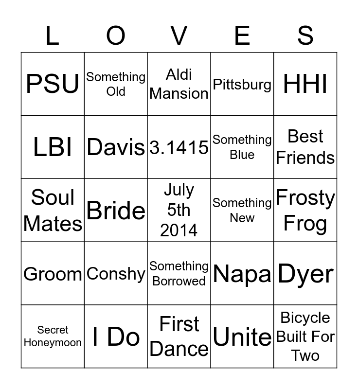 This bingo card has a free space and 24 words: Conshy, I Do, 3.1415, Secret Honeymoon, HHI, PSU, LBI, Something Old, Something New, Something Borrowed, Something Blue, Soul Mates, Napa, Dyer, Davis, Unite, Frosty Frog, Aldi Mansion, Best Friends, Bride, Bicycle Built For Two, Groom, Pittsburg and First Dance.