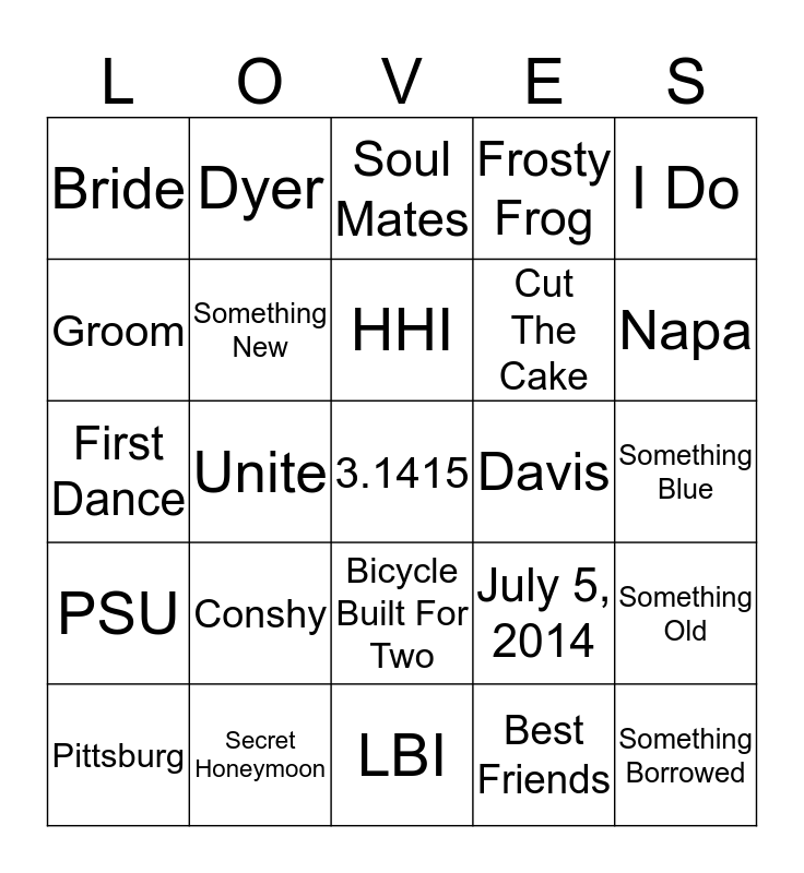 This bingo card has 25 words: Conshy, LBI, HHI, Pittsburg, I Do, Bride, Groom, Dyer, Davis, Bicycle Built For Two, Cut The Cake, First Dance, July 5, 2014, Something Old, Something New, Something Borrowed, Something Blue, Soul Mates, Napa, Unite, 3.1415, Secret Honeymoon, PSU, Frosty Frog and Best Friends.