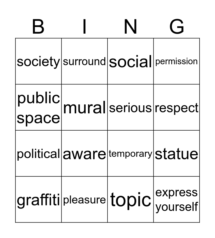 This bingo card has 20 words: statue, view, social, take down, graffiti, public space, pleasure, society, political, surround, aware, temporary, mural, express yourself, serious, illegal, respect, permission, topic and joy.