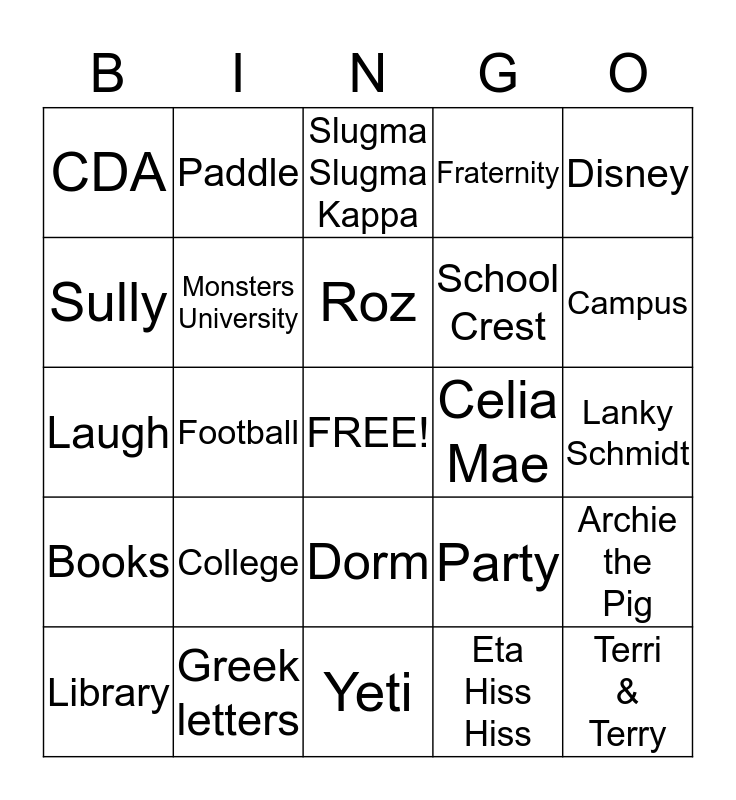 This bingo card has a free space and 24 words: College, Greek letters, Roz, Library, Disney, CDA, Sully, Paddle, Celia Mae, Dorm, School Crest, Laugh, Party, Archie the Pig, Monsters University, Eta Hiss Hiss, Lanky Schmidt, Slugma Slugma Kappa, Campus, Football, Terri & Terry, Books, Fraternity and Yeti.