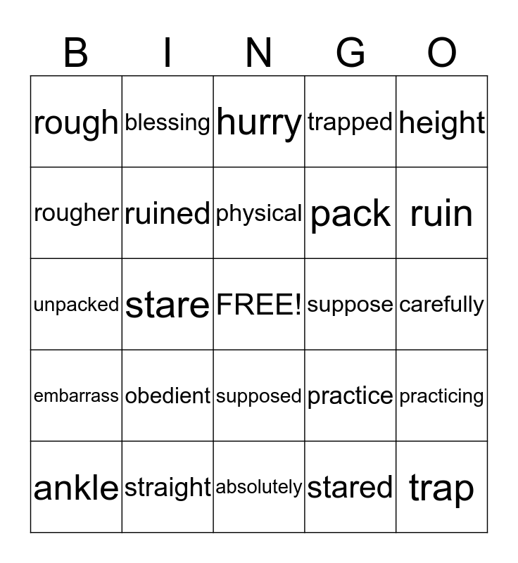 This bingo card has a free space and 24 words: obedient, straight, physical, ankle, height, rough, rougher, blessing, suppose, supposed, pack, unpacked, practice, practicing, ruined, stared, carefully, hurry, ruin, stare, trap, embarrass, trapped and absolutely.