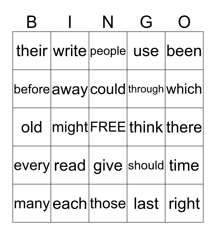 This bingo card has a free space and 24 words: read, each, could, many, been, their, before, write, think, give, through, old, should, time, away, last, there, people, which, might, right, every, use and those.