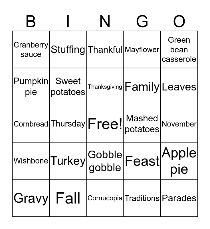 This bingo card has a free space and 24 words: Turkey, Fall, Thanksgiving, Gravy, Green bean casserole, Cranberry sauce, Pumpkin pie, Stuffing, Mashed potatoes, Gobble gobble, Family, Cornbread, Feast, Apple pie, Sweet potatoes, Traditions, November, Thankful, Leaves, Thursday, Parades, Wishbone, Mayflower and Cornucopia.