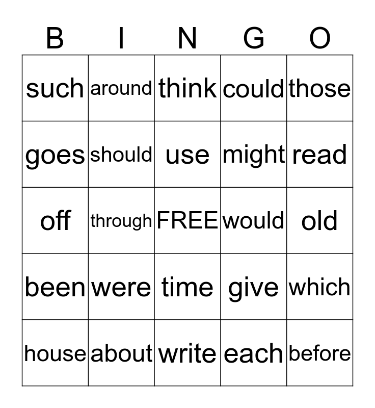This bingo card has a free space and 24 words: were, about, use, house, those, such, goes, around, would, time, might, off, give, which, should, each, old, think, read, through, before, been, could and write.