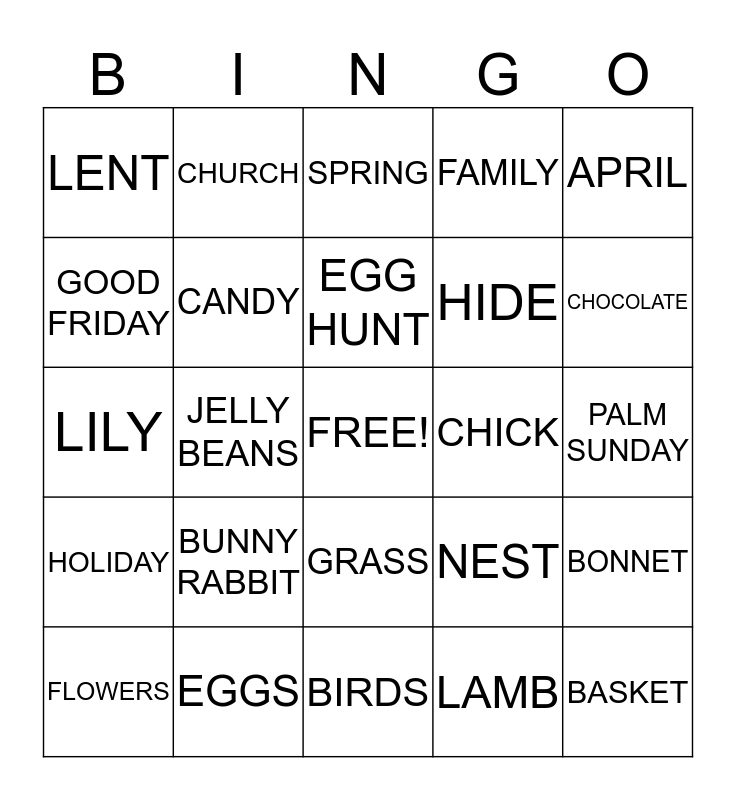 This bingo card has a free space and 24 words: BUNNY RABBIT, EGGS, EGG HUNT, FLOWERS, APRIL, LENT, GOOD FRIDAY, CHURCH, CHICK, GRASS, HIDE, LILY, NEST, BONNET, CANDY, LAMB, PALM SUNDAY, SPRING, CHOCOLATE, JELLY BEANS, BASKET, HOLIDAY, FAMILY and BIRDS.