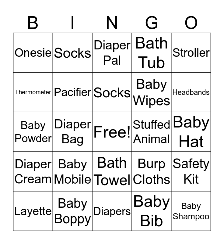This bingo card has a free space and 40 words: Baby Rattle, Baby Powder, Baby Bottle, Pacifier, Baby Boppy, Bath Towel, Socks, Blanket, Stroller, Diaper Cream, Diaper Bag, Bath Tub, Baby Shampoo, Baby Hat, Stuffed Animal, Baby Mobile, Crib Bedding, Onesie, Baby Comb, Diaper Pal, Safety Kit, Baby Bib, Baby Wipes, Thermometer, Crib Bedding, Onesie, Baby Comb, Diaper Pal, Baby Book, Baby Bouncer, Baby Wash, Layette, Pajamas, Burp Cloths, Headbands, Diapers, Baby Boppy, Bath Towel, Socks and Blanket.