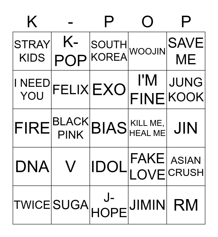 This bingo card has a free space and 29 words: TWICE, BTS, BLACK PINK, EVER GLOW, STRAY KIDS, SOUTH KOREA, FELIX, V, KILL ME, HEAL ME, SUGA, JIN, RM, J-HOPE, JIMIN, JUNG KOOK, RUN, IDOL, DNA, SAVE ME, FIRE, FAKE LOVE, NOT TODAY, I'M FINE, I NEED YOU, WOOJIN, K- POP, ASIAN CRUSH, EXO and ARMY.