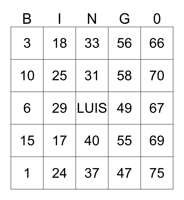 This bingo card has a free space and 24 words: 1, 17, 31, 47, 66, 3, 18, 33, 49, 67, 6, 25, 55, 69, 10, 24, 37, 56, 70, 15, 29, 40, 58 and 75.