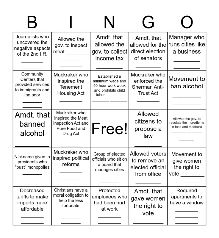 This bingo card has a free space and 24 words: Muckraker who inspired political reforms ________ ________ ________, Christians have a moral obligation to help the less fortunate _________ ________ ________, Established a minimum wage and 40-hour work week and prohibits child labor ________ ________ ________ ________, Decreased tariffs to make imports more affordable ________ ________, Manager who runs cities like a business ________ ________, Journalists who uncovered the negative aspects of the 2nd I.R. ________ ________, Community Centers that provided services to immigrants and the poor ________ ________, Allowed the gov. to inspect meat ________ ________ ________, Allowed citizens to propose a law ________, Group of elected officials who sit on a board that manages cities ________ ________, Muckraker who enforced the Sherman Anti-Trust Act ________ ________, Amdt. that banned alcohol ________, Allowed voters to remove an elected official from office ________, Movement to give women the right to vote ________ ________, Muckraker who inspired the Tenement Housing Act ________ ________, Amdt. that gave women the right to vote _________, Allowed the gov. to regulate the ingredients in food and medicine ________ ________ ________ ________ ________, Amdt. that allowed the gov. to collect income tax ________, Movement to ban alcohol ________ ________, Muckraker who inspired the Meat Inspection Act and Pure Food and Drug Act ________ ________, Required apartments to have a window ________ ________ ________, Nickname given to presidents who "bust" monopolies ________ ________, Amdt. that allowed for the direct election of senators ________ and Protected employees who had been hurt at work ________ ________.