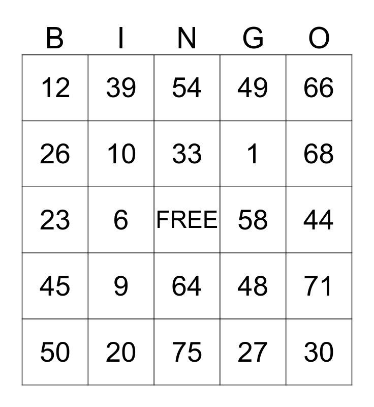 This bingo card has a free space and 24 words: 9, 20, 33, 50, 66, 12, 26, 39, 58, 64, 1, 23, 48, 71, 10, 27, 44, 54, 68, 6, 30, 45, 49 and 75.