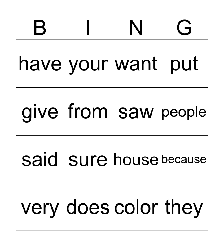This bingo card has 16 words: does, because, want, have, said, your, house, color, give, from, very, put, sure, people, saw and they.