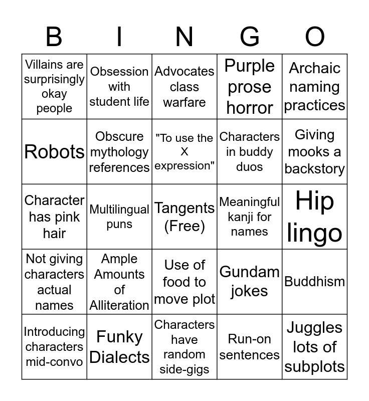 This bingo card has a free space and 24 words: Ample Amounts of Alliteration, Funky Dialects, "To use the X expression", Introducing characters mid-convo, Archaic naming practices, Villains are surprisingly okay people, Robots, Obsession with student life, Meaningful kanji for names, Use of food to move plot, Characters in buddy duos, Character has pink hair, Gundam jokes, Buddhism, Obscure mythology references, Run-on sentences, Hip lingo, Advocates class warfare, Giving mooks a backstory, Multilingual puns, Juggles lots of subplots, Not giving characters actual names, Purple prose horror and Characters have random side-gigs.