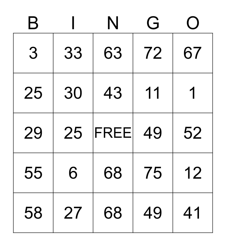 This bingo card has a free space and 24 words: 6, 27, 43, 58, 67, 3, 25, 33, 49, 68, 11, 29, 75, 12, 30, 49, 52, 63, 1, 25, 41, 55, 72 and 68.
