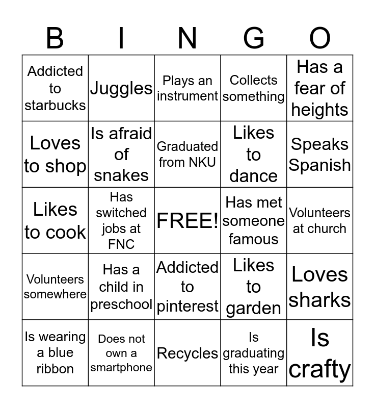 This bingo card has a free space and 32 words: Is graduating this year, Started as a volunteer, Has switched jobs at FNC, Has more than one pet, Volunteers somewhere, Is afraid of snakes, Has a fear of heights, Loves sharks, Juggles, Worked as a teacher, Graduated from NKU, Plays an instrument, Is currently in school, Has been in a helicopter, Has met someone famous, Is running the FNC race, Is wearing a blue ribbon, Likes to cook, Addicted to pinterest, Has a child in preschool, Likes to garden, Watches American Idol, Volunteers at church, Does not own a smartphone, Is crafty, Collects something, Likes to dance, Loves to shop, Addicted to starbucks, Recycles, Is trauma informed and Speaks Spanish.