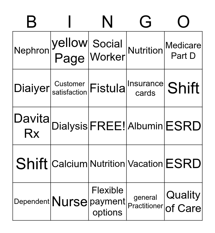 This bingo card has a free space and 24 words: Calcium, Nurse, Fistula, Dependent, Medicare Part D, Nephron, Diaiyer, yellow Page, Albumin, Nutrition, Insurance cards, Davita Rx, Vacation, ESRD, Customer satisfaction, general Practitioner, ESRD, Social Worker, Shift, Dialysis, Quality of Care, Shift, Nutrition and Flexible payment options.