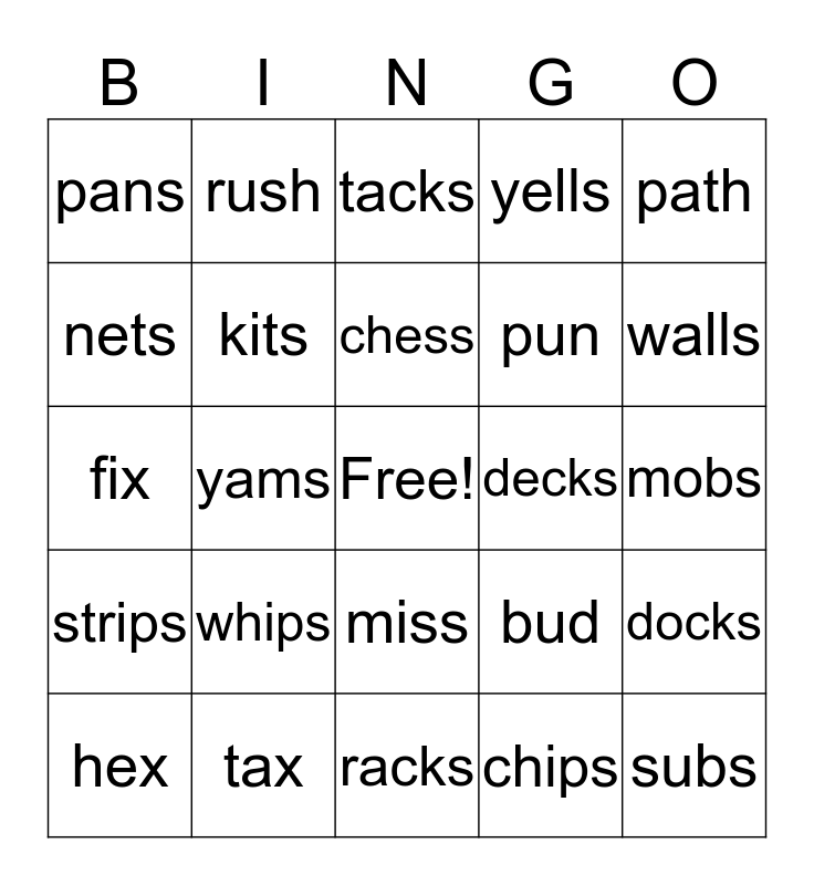This bingo card has a free space and 24 words: whips, tax, chess, hex, path, pans, nets, rush, decks, miss, pun, fix, bud, docks, kits, chips, mobs, tacks, walls, yams, subs, strips, yells and racks.