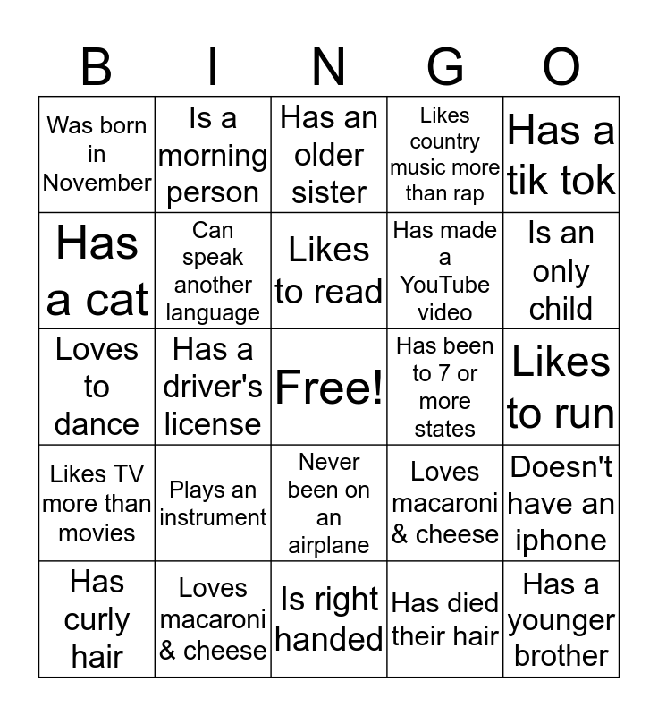 This bingo card has a free space and 29 words: Has curly hair, Hates pizza, Has a driver's license, Plays two or more sports, Was born in November, Has an older sister, Can speak another language, Plays an instrument, Has been to 7 or more states, Loves macaroni & cheese, Likes to run, Has a younger brother, Is right handed, Has died their hair, Is an only child, Favorite holiday is Hanukkah, Never been on an airplane, Likes TV more than movies, Has a tik tok, Loves to dance, Loves macaroni & cheese, Has ridden a horse, Has made a YouTube video, Has a cat, Likes country music more than rap, Is a morning person, Doesn't have an iphone, Likes to read and Goes to camp.
