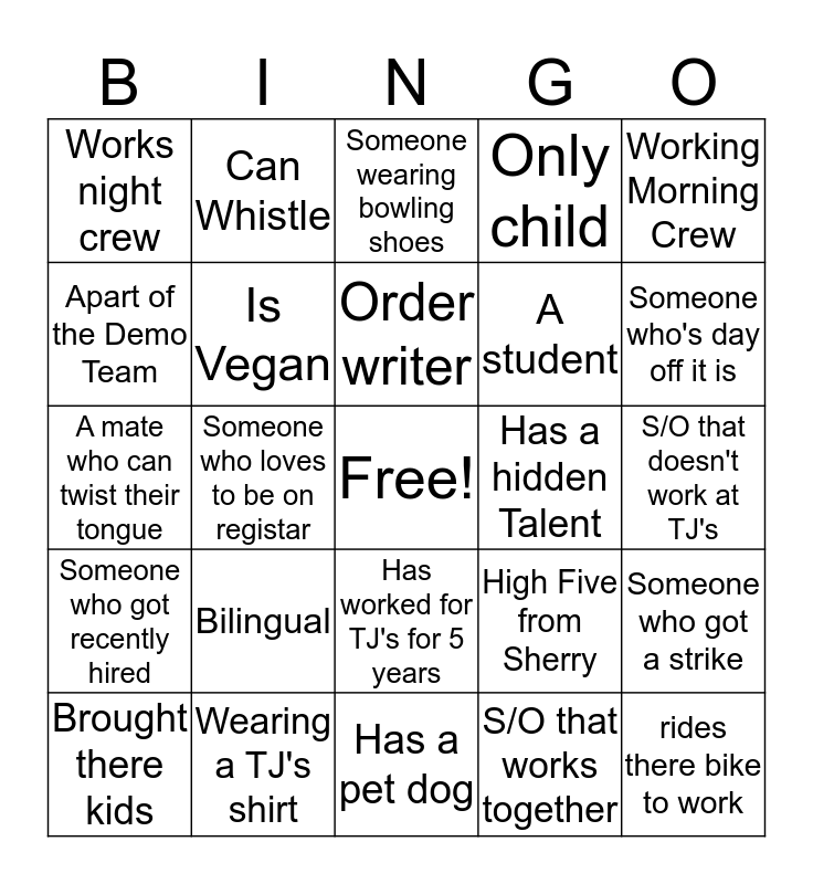 This bingo card has a free space and 24 words: Bilingual, Wearing a TJ's shirt, Order writer, Brought there kids, Working Morning Crew, Works night crew, Apart of the Demo Team, Can Whistle, Has a hidden Talent, Has worked for TJ's for 5 years, A student, A mate who can twist their tongue, High Five from Sherry, Someone who got a strike, Is Vegan, S/O that works together, S/O that doesn't work at TJ's, Someone wearing bowling shoes, Someone who's day off it is, Someone who loves to be on registar, rides there bike to work, Someone who got recently hired, Only child and Has a pet dog.