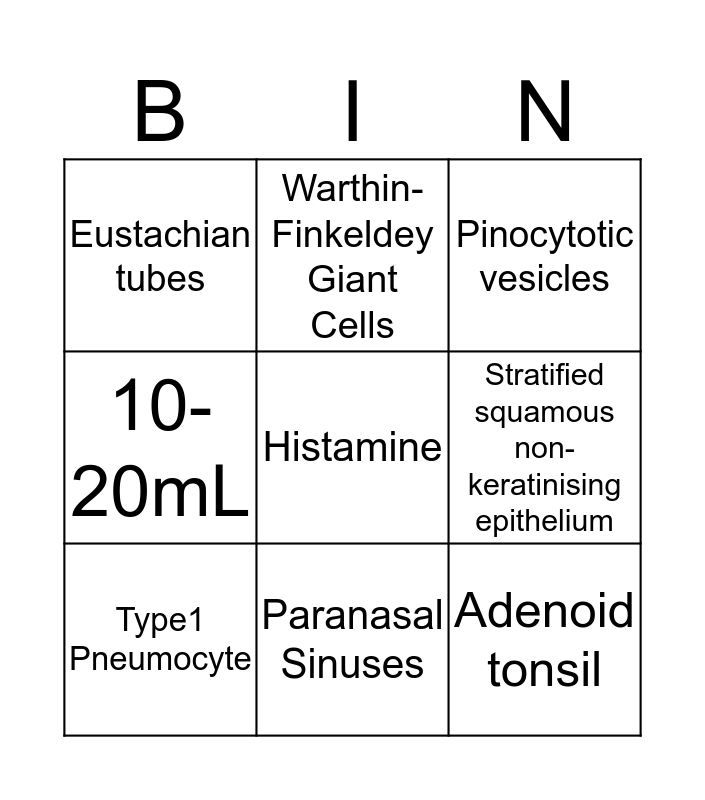 This bingo card has a free space and 25 words: Vestibule, Surface Area, Paranasal Sinuses, Hay Fever, Adenoid tonsil, Eustachian tubes, Stratified squamous non-keratinising epithelium, Warthin-Finkeldey Giant Cells, Pseudostratified columnar ciliated epithelium, Lamina Propria, C-shaped, Bronchitis, Oxygen, Pores of Kohn, Type1 Pneumocyte, Collagen, Elastic fibres, Pinocytotic vesicles, Pulmonary surfactant, Mycobacterium tuberculosis, Tuberculosis, Necrosis, Pleura, 10-20mL and Fibrinous Pleuritis.