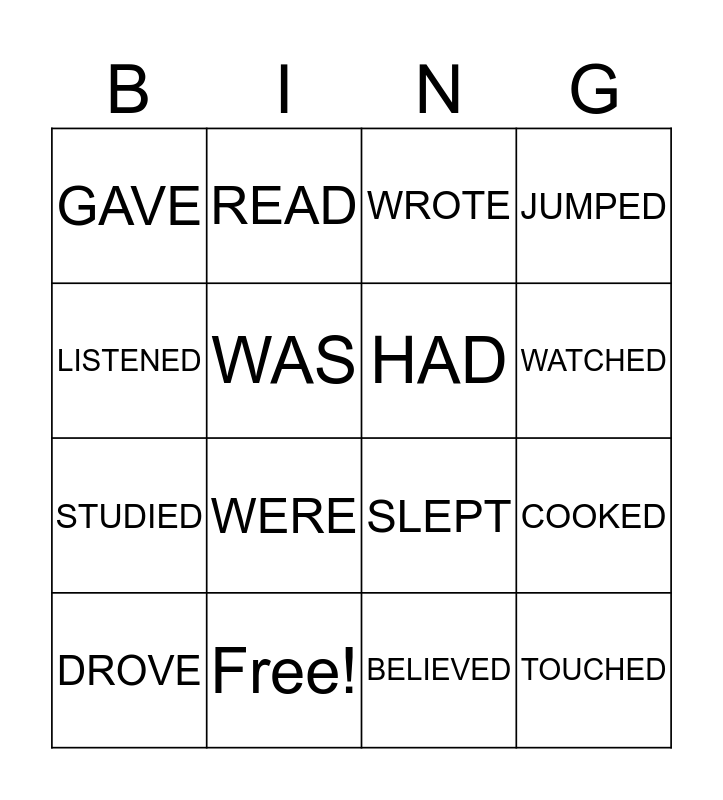 This bingo card has 24 words: DID, HOPED, WATCHED, SAID, LISTENED, GAVE, WAS, READ, Free!, WANTED, STUDIED, SLEPT, TAUGHT, TALKED, HAD, SPOKE, BELIEVED, WROTE, WERE, COOKED, DROVE, TOUCHED, JUMPED and RAN.