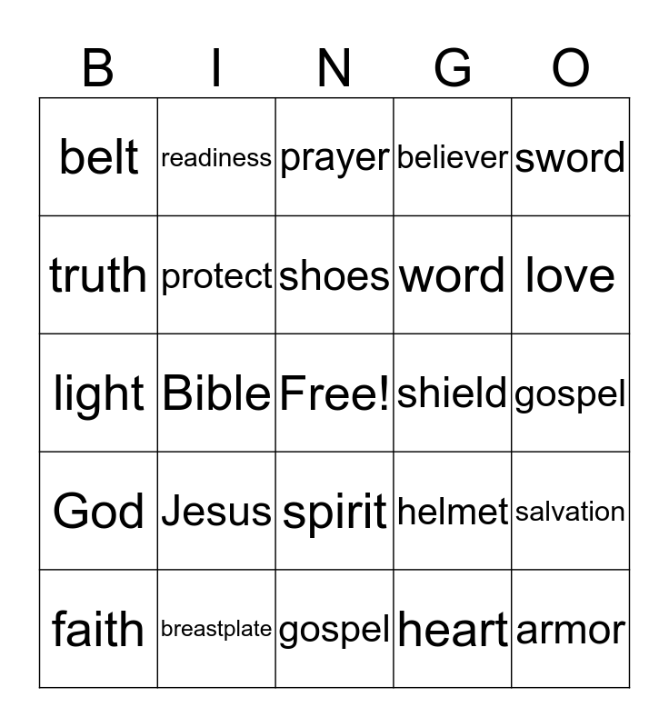 This bingo card has a free space and 24 words: Jesus, breastplate, shoes, faith, sword, belt, truth, readiness, shield, spirit, word, light, helmet, salvation, protect, heart, gospel, prayer, love, Bible, armor, God, believer and gospel.
