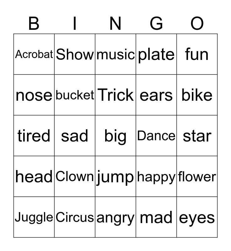 This bingo card has a free space and 24 words: Clown, Circus, Trick, Juggle, fun, Acrobat, nose, Show, Dance, jump, ears, tired, happy, flower, bucket, mad, star, music, bike, sad, eyes, head, plate and angry.