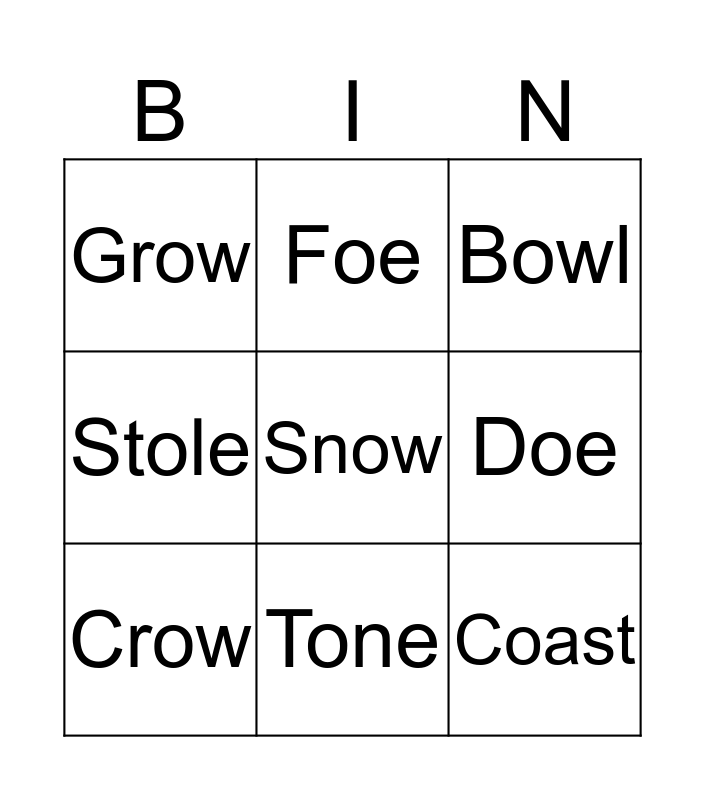 This bingo card has 15 words: Boat, Smoke, Bowl, Grow, Tone, Snow, Slope, Woke, Doe, Coast, Roast, Stole, Crow, Foe and Blow.