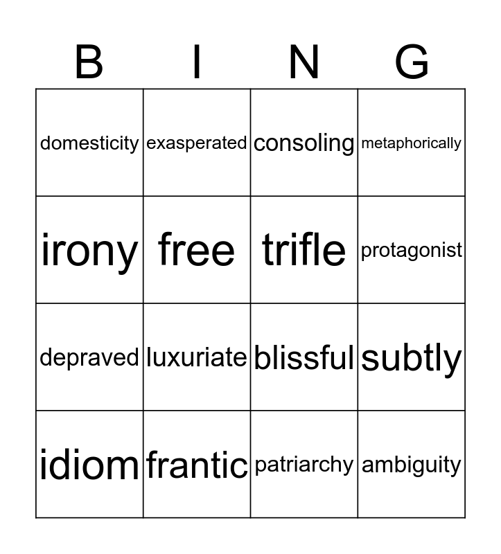 This bingo card has 16 words: frantic, subtly, consoling, domesticity, depraved, exasperated, blissful, patriarchy, irony, free, idiom, metaphorically, luxuriate, protagonist, trifle and ambiguity.